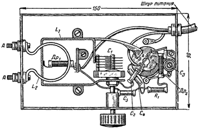 Рис.1. Схема передатчика Частота генератора определяется элементами контура L1C1. Дроссели Др1 и Др2 рассчитаны на рабочую частоту генератора. Для улучшения стабильности в передатчике применен несколько необычный контур. Он состоит из индуктивности с высокой добротностью и конденсатора большой емкости. Контурной катушки обычного вида в генераторе нет. Вместо нее применена прямоугольная скоба L1, изготовленная из листовой меди или латуни, толщиной 0,5...1 мм.