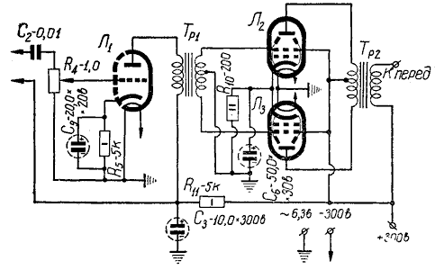 Рис.3. Монтаж передатчика Скоба L1 укрепляется на шасси с помощью изоляторов. Пайка скобы с конденсатором должна быть выполнена очень качественно мощным паяльником. Если поверхность соединения будет мала, то повысится сопротивление этой части контура, а качество его может оказаться низким. Справа от шасси укреплена изолированная планка с двумя зажимами, к которым крепится один виток - антенная катушка, находящаяся на расстоянии 2...3 мм от скобы L1. Виток делается из жесткого медного провода, диаметром 2...3 мм. К панельке (контакты 8, 1 и 2) припаивается пластинка из меди или латуни, к которой в свою очередь, припаиваются все детали, соединенные с минусом анода. К контактам 3 и 4 припаивается полоска, отходящая от скобы L1. Расположение деталей таково, что соединительные провода отсутствуют и весь монтаж - на ламповой панельке. Питание подводится 4-х проводным шнуром. Связь с антенной подбирается путем изменения расстояния между витком L2 и скобой L1. Нужно иметь ввиду, что изменение связи с антенной в некоторых пределах изменяет частоту передатчика. Модулятор передатчика Л1 - усилитель напряжения (1/2 6Н1П); Л2, Л3 - двухтактный усилитель мощности (6П1П).