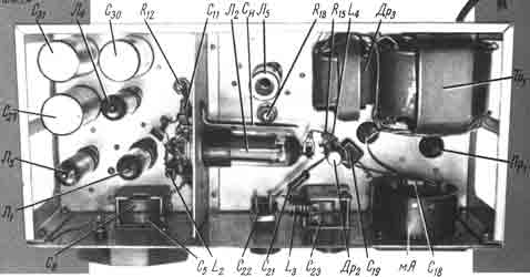 Рис.2. Вид сверху Настройка передатчика Прежде необходимо проверить монтаж и напряжения, приведенные на принципиальной схеме. Диапазон частот, перекрываемых ЗГ 9,333...9,9 МГц, устанавливают с помощью ГИРа, подбирая емкости С1 и С2. После этого необходимо произвести температурную компенсацию контура ЗГ подбором конденсаторов С3 и С4. Установив блок КПЕ С5С8 в среднее положение, настраивают контур в анодной цепи лампы Л1 при помощи сердечника катушки L2 на третью гармонику частоты ЗГ. Частоту, выделяемую этим контуром контролируют резонансным волномером. После настройки контура поднесенная к L2 неоновая лампа МН-3 должна светиться. При настройке выходного каскада переключатель П1 должен находиться в положении "Тлф". Сначала ползунок R12 передвигают влево (по схеме) до упора. К антенному гнезду подключают лампу накаливания 127 В/25 Вт и настраивают контур L3C22C23 по максимуму свечения этой лампы. Максимум свечения лампы должен совпадать с минимумом анодного тока Л2, наблюдаемому по показания миллиамперметра. Если такого совпадения нет, то нужно подстроить конденсатор нейтрализации Сн, подгибая его пластину к баллону лампы или отгибая от него. Минимальный анодный ток Л2 должен составлять 70...80 мА. Рабочий режим передатчика устанавливают, изменяя напряжение смещения на управляющей сетке Л2 (поворотом ползунка потенциометра R12) до уменьшения анодного тока Л2 ровно в два раза. Полученную величину анодного тока необходимо запомнить - при подключении к передатчику антенны связь с нею необходимо подбирать так, чтобы анодный ток Л2 был равен этой величине. Микрофонный усилитель проверяют, подключив к аноду левого (по схеме) триода лампы Л5 через конденсатор 0,5 мкФ высокоомный головной телефон; при разговоре перед микрофоном в телефоне должен прослушиваться громкий и неискаженный сигнал. Уровень усиления микрофонного усилителя подбирают следующим образом: при нормальной громкости разговора перед микрофоном постепенно передвигают движок потенциометра R18 в верхнее (по схеме) положение. Когда при произнесении перед микрофоном громких звуков анодный ток Л2 начинает увеличиваться на 10...15% против нормального, усиление микрофонного усилителя достаточно. Дальнейшее увеличение усиления приведет не к повышению слышимости сигнала корреспондентом, а лишь к появлению искажений и расширению полосы частот, излучаемых передатчиком.
