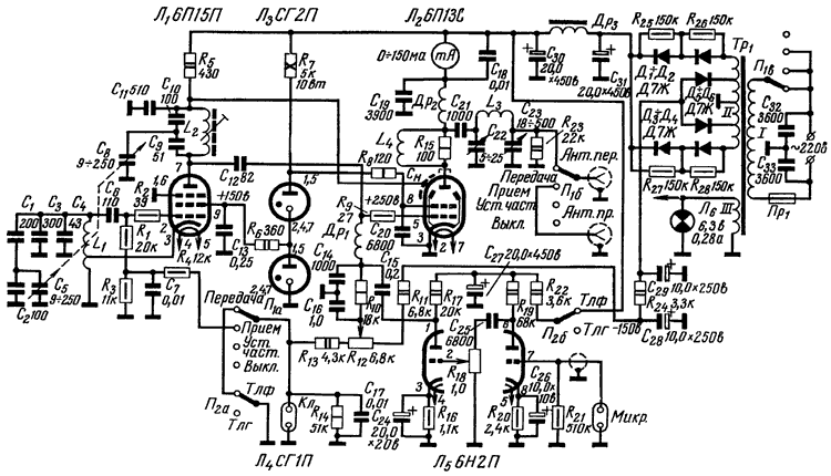 Ом. Микрофонный усилитель-модулятор Л5 (6Н2П) собран по стандартной схеме УНЧ. Уровень модуляции регулируется потенциометром R18 в сеточной цепи второго каскада усилителя. Точная настройка выходного каскада осуществляется по милиамперметру 150 мА в анодной цепи Л2. Положение переключателя П1 1. "Выключено". Передатчик не работает. 2. "Установка частоты". Для настройки передатчика на частоту корреспондента. Лампа УМ заперта. Лампа ЗГ открыта. Работа одного каскада ЗГ хорошо прослушивается на приемнике, стоящем рядом, но совершенно не мешает работе других радиостанций. 3. "Прием". Обе лампы заперты. Передатчик не мешает приему. Группа контактов переключателя П1б переключает антенну к приемнику. 4. "Передача". При установке П2 в положение "Тлф" (работа микрофоном) осуществляется амплитудная модуляция незатухающих колебаний ЗГ. В результате на аноде Л2 появится амплитудно модулированнй сигнал. 5. "Передача". При установке П2 в положение "Тлг" (работа телеграфом). При нажатии-отпускании телеграфного ключа лампа Л2 плавно отпирается-запирается. При этом телеграфный сигнал имеет хорошую форму. Детали и конструкция