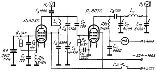 Задающий генератор выполнен на лампе 6П3С (Л1) по трехточечной схеме с емкостной обратной связью и кварцевой стабилизацией частоты.