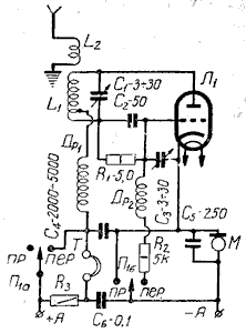 служит анодной нагрузкой сверхрегенеративного детектора. Приемо-передатчик может быть собран на лампах 6Н8С, 6Н1П, 6Н2П и 6Н3П. Особенно хорошо работает 6Н3П как на частотах 38...40 МГц, так и на 144...146 МГц. При модуляции однолампового генератора могут появиться фон переменного тока и искажения при приеме за счет паразитной частотной модуляции. Могут наблюдаться срывы колебаний ВЧ при глубокой модуляции, когда при больших амплитудах модуляции на аноде генератора понижается напряжение. Важно!!! Устойчиво работающий одноламповый передатчик трудно построить даже на КВ, еще труднее сделать это на УКВ. Однако, учитывая простоту подобных конструкций, поэкспериментировать полезно.