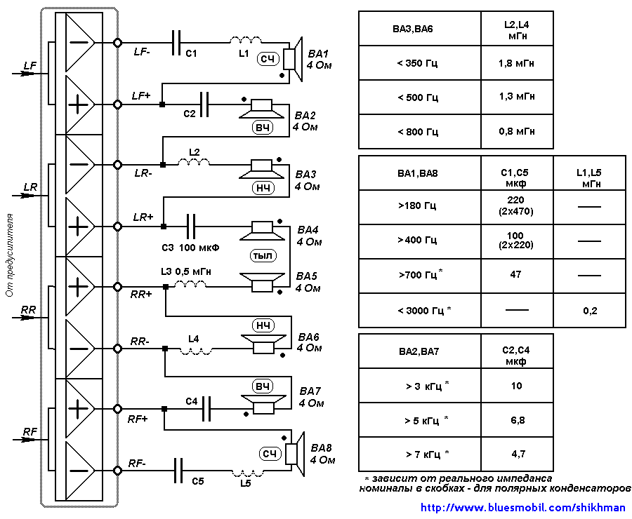 Рекомендации.Поскольку используется инвертирующие и неинвертирующие выходы встроенного усилителя, обратите внимание на полярность подключения головок. В тех случаях, когда по схеме требуется соединение одного из выводов нагрузки с "массой", это необходимо делать на корпусе магнитолы или на "минусовом" проводе питания как можно ближе к ее корпусу. Соединение с "массой" автомобиля недопустимо!Для схем с мостовым вариантом подключения нагрузки в составе фильтров необходимо использовать неполярные оксидные (электролитические) конденсаторы. В крайнем случае их можно составить из двух полярных вдвое большей емкости, соединив их встречно-последовательно ("плюс" к "плюсу"), но качество звучания с неполярными конденсаторами выше. Конденсаторы небольшой емкости лучше использовать бумажные или полипропиленовые. Расчет фильтра НЧ для сабвуфера производится обычным способом. Однако в конструкцию фильтра второго порядка желательно ввести резистор сопротивлением 1 Ом, как показано на схемах. Это снизит вероятность перегрузки усилителя магнитолы. Частота раздела и порядок ФНЧ для сабвуфера выбираются в пределах 80...200 Гц в зависимости от места размещения низкочастотной головки. Если она размещена в задней части салона, частоту раздела следует выбирать как можно ниже, а порядок - выше, чтобы избежать воспроизведения сабвуфером "голосового" диапазона. Однако это требует изготовления поистине циклопических катушек индуктивности. С одной стороны, использовать в их конструкции ферромагнитные сердечники нежелательно, поскольку искажения, вызванные неизбежным намагничиванием сердечника, значительно ухудшают качество звучания. С другой стороны, использование сердечника позволяет резко снизить активное сопротивление катушки и потери в ней, что особенно актуально при использовании встроенных усилителей магнитолы. Так что выбор нужно делать в каждом конкретном случае. Словом, вариантов много - была бы фантазия.