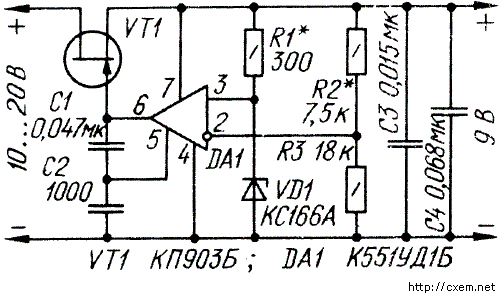 Коэффициент стабилизации напряжения измерен при токе нагрузки 30mA цифровым вольтметром В7-34. При изменении входного напряжения от 10 до 20 V выходное изменялось не более, чем на на 0,0001 V, что соответствует коэффициенту стабилизации 70 000. Стабилизатор не боится короткого замыкания на выходе,и перегрузок по току. С увеличением тока нагрузки напряжение затвор-исток полевого транзистора уменьшается. При этом напряжение на выходе ОУ увеличивается до максимального значения, которое всегда меньше питающего напряжения. При дальнейшем увеличении тока нагрузки напряжение затвор-исток транзистора становится постоянным и равным разности выходного напряжения стабилизатора и напряжения насыщения на выходе ОУ-стабилизатор переходит в режим стабилизации выходного тока. При коротком замыкании на выходе ток через стабилизатор не может превысить своего максимального значения, равного току стока транзистора при нулевом напряжении между затвором и истоком. Мощность, рассеиваемая регулирующим транзистором при длительном коротком замыкании на выходе стабилизатора не должна превышать допустимую (для транзистора КП903Б-6Вт при температуре воздуха не выше 25оС). Если, например максимальный ток стока транзистора равен 400 mA, то мощности 6Вт соответствует напряжение 15В. Это наибольшее входное наряжение стабилизатора при длительном замыкании на выходе. При токе нагрузки более 30mA регулирующий транзистор необходимо устанавливать на теплоотвод. Конденсаторы C1 и C2 корректируют частотную характеристику ОУ, а C3 и С4- блокируют цепи питания ОУ и нагрузки. Конденсотор C3 надо монтировать возможно ближе к ОУ. Ослабление влияния колебаний температуры окружающей среды на выходное напряжение достигается использованием в стабилизаторе проволочных резисторов и термостабилизированных стабилитрона и ОУ. В результате, за первую минуту после включения питания выходное напряжение стабилизатора изменяется в пределах до 800 мкВ, за следующие 20 мин не более, чем на 100 мкВ. Стабилитрон КС166А можно заменить на КС162А, КС168А, а ОУ К551УД1Б-на К153УД5, К140УД12, К140УД6, К149УД7, К140УД10, К140УД11, К153УД2, К153УД4, К153УД6 или К140УД1А с соответсвующими цепями коррекции. Но при такой замене стабильность выходного напряжения несколько ухудшится, потому что коэффициент стабилизации напряжения прямо пропорционален коэффициенту усиления ОУ. Налаживание стабилизатора сводится к установке необходимого выходного напряжения путем изменения соотношения номиналов R2 и R3.