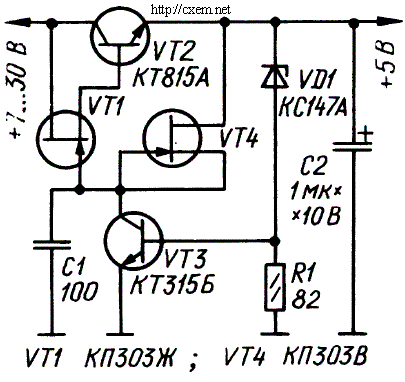 Несмотря на относительную простоту, этот стабилизатор имеет весьма высокий коэффициент стабилизации при токе нагрузки др 0,5 А. Достигнуто это за счет фактического применения в нем двух стабилизаторов - последовательного и параллельного. Минимальное падение напряжения на регулирующем элементе - 1,2В, а максимальный ток нагрузки определяется начальным током стока полевого транзистора VT1, и коэффициентом усиления транзистора VT2 и может достигать 0,5...0,8А.