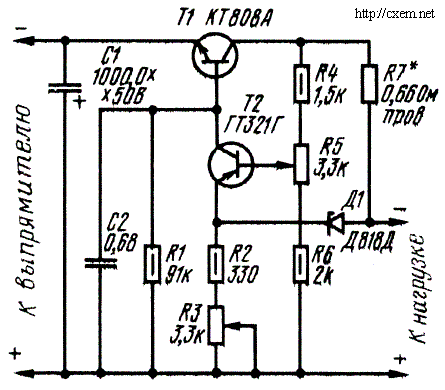 Стабилизатор обеспечивает на нагрузке регулируемое напряжение от 15 до 38 В при номинальном напряжении выпрямителя 42 В. Ток нагрузки до 3А. Коэффициент стабилизации - не менее 300, амплитуда пульсации пульсации выходного напряжения не более 5 мВ. Низкое выходное сопротивление обусловлено наличием цепи обратной связи по току. Напряжение обратной связи снимается с резистора R7 и поступает в цепь базы транзистора Т2. Трансформатор питания стабилизатора мощностью около 100 Вт. Транзистор Т1 можно использовать типов
