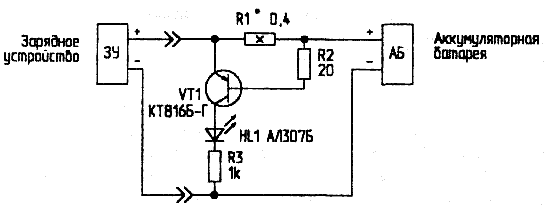 Если зарядное устройство (ЗУ) для автомобильных аккумуляторов не имеет амперметра, трудно гарантировать их надежную зарядку. Возможно ухудшение (пропадание) контакта на клеммах батареи, обнаружить которое достаточно трудно. Вместо амперметра предлагаю простой индикатор буквально из нескольких деталей. Он включается в разрыв "плюсового" провода от ЗУ к АБ.