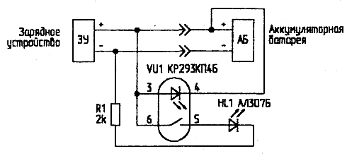 Рис. 1. Индикатор тока заряда На рис.2 показана аналогичная схема, но с применением оптоэлектронного ключа КР293КП4. Такие оптроны популярны сегодня среди радиолюбителей, они позволяют конструировать радиоэлектронные устройства с минимальным количеством элементов. Резистор, ограничивающий ток в цепи светодиода оптрона, не нужен, так как для уверенного срабатывания ключа необходимо напряжение на контактах 3,4 порядка 1,1... 1,5 В. Ток в этой цепи - 10... 15 мА. Особенность схемы - в подключении исполнительного устройства на оптронном ключе. Как видно из рисунка, вход оптрона (светодиод) включается у клеммы "+" ЗУ с одной стороны, и у соответствующей клеммы "+" АБ - с другой. Резистором, на котором падает напряжение, в данном случае является сам соединительный провод между ЗУ и АБ, имеющий длину 0,8...1,5 м. При надежном контакте в клеммах, падения напряжения на немдостаточно для срабатывания оптронного ключа. Контакты 5, 6 VU1 замыкаются , в цепи HL1 течет ток, и светодиод горит. При использовании этого индикатора в приборах с большим напряжением питания, например, для зарядки АБ грузовых автомобилей с напряжением бортовой сети 24 В, необходимо подобрать величину R1, чтобы ток через светодиод не превышал максимально допустимый. Такие индикаторы тока можно применить и в других конструкциях, где необходим контроль тока нагрузки. Включаются они аналогичным способом - между нагрузкой и источником питания. Автор: А. Кашкаров,