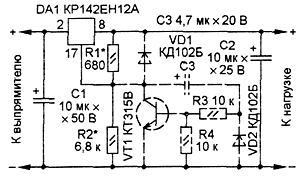 Рис.1. Типовая схема стабилизатора При включении стабилизатора на выходе микросхемы появляется напряжение. Поскольку конденсатор СЗ начинает заряжаться, транзистор VT1 будет открыт и в начальный момент выходное напряжение не превысит 2,4 В. По мере зарядки конденсатора транзистор закрывается и напряжение на его коллекторе увеличивается. Следовательно, возрастает и выходное напряжение. Когда конденсатор зарядится, выходное напряжение достигнет установленного значения. Транзистор полностью закроется и не будет оказывать влияния на работу стабилизатора. После отключения устройства конденсатор СЗ быстро разряжается через диоды VD1 и VD2, резистивный делитель R1R2 и нагрузку. Время нарастания выходного напряжения зависит в первую очередь от емкости конденсатора СЗ и сопротивления резистора R4 и в меньшей степени — от коэффициента передачи тока транзистора. Для сравнения было измерено время нарастания выходного напряжения стабилизатора. При выходном напряжении 15 В, сопротивлении нагрузки 15 Ом и емкости конденсаторов фильтров выпрямителя и нагрузки по 4700 мкФ без указанной доработки это время составило примерно 30 мс. А после введения дополнительного узла — примерно 1,5...2 с. Допустимые напряжения всех конденсаторов и транзистора должны соответствовать рабочим напряжениям в конкретном стабилизаторе напряжения. Подобным образом можно доработать стабилизаторы и на основе других микросхем, только для стабилизаторов, включенных в минусовую цепь, необходимо применить транзистор другой структуры и изменить полярность включения конденсаторов. Кроме того, такие дополнительные узлы можно ввести в блок питания с несколькими выходными напряжениями для того, чтобы обеспечить определенную последовательность подачи питающих напряжений. Автор: И.НЕЧАЕВ, г. Курск