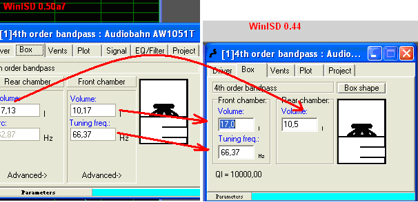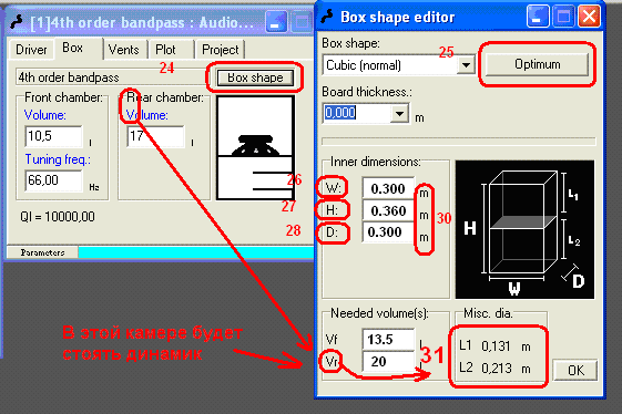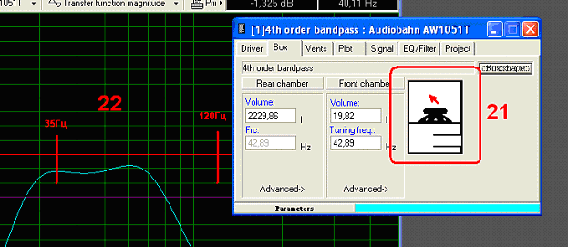 Переносим параметры ящика из WinISD 0.50a7 в WinISD 0.44. 24. Нажимаем чтобы начать рассчитывать размера ящика.