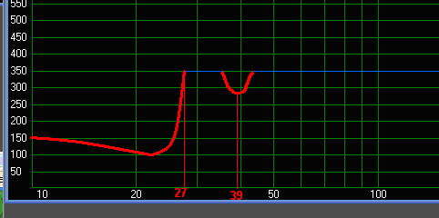 21. Нажимаем на схематично показанном ящике правой кнопкой мыши удерживая передвигаем курсор по оси (X) тесть по горизонтали меняем объём по оси(Y) по вертикали чтобы изменить частоту. Аналогично Левой кнопкой мыши чтобы изменить параметры нижней камеры. Макушка кривой должна находиться выше красной линии между 35Гц и 120Гц если это сабвуфер как можно шире и ровнее. Transfer function magnitude. АЧХ Примерно так, но нижний предел 40Гц, а верхний 113Гц, это тоже подходит. Выбираем график: Maximum Power. Maximum Power На этом графике программа показывает максимальную мощность относительно частоты. Видно, что имеется спад мощности пик спада 60 ватт на 39 герцах на практике диффузору динамика не хватает хода(Xmax) и появляются неприятные звуки – искажения. На готовом изделии это надо тоже учесть и ограничить мощность Выбираем график Maximum SPL Maximum SPL. Этот график показывает максимальное звуковое давление Также видно спад. По той же причине. Последние два графика от другого динамика, я показал их чтобы наглядней было.