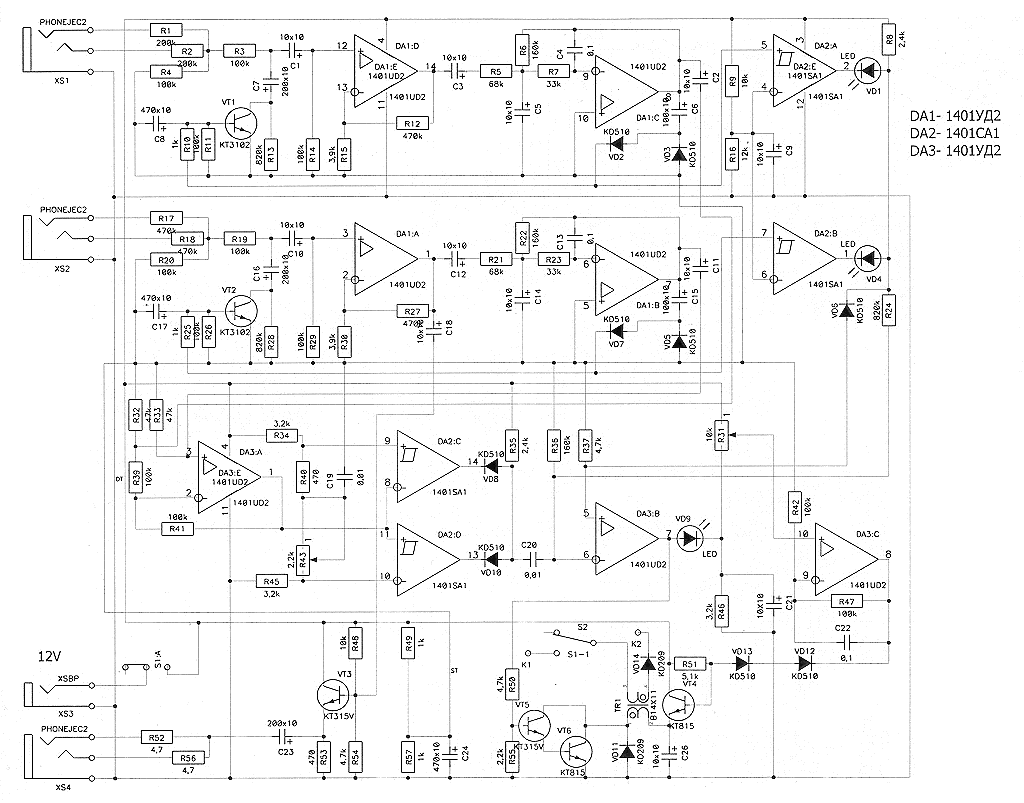 Хочу сразу предупредить, что метод и устройство несколько садистские, но для тех, кто все попробовал и результат "ноль", может это последняя возможность заговорить нормально. Все основано на внедрении в подсознание боязни говорить неправильно. Страх - наилучший стимулятор, а в сочетании с аутотренингом обеспечивает максимальную эффективность. При разработке приоритетом была простота, и доступность деталей. Все смонтировано на одной печатной плате с выносным блоком питания 12В. Использовать устройство можно совместно с любым источником аудиосигнала (плеер, магнитофон, компьютер) 100-200 мВ. Устройство содержит два канала усиления аудиосигнала с эффективной АРУ и ФНЧ с частотой среза 2,4 Гц для выделения фонемов речевого сигнала, схемы контроля амплитуды аудиосигнала, схемы выделения разностного сигнала, схемы контроля уровня допустимой ошибки, формирователя стимулирующих импульсов. На вход XS1 подают речевой сигнал с микрофона пациента, на вход XS2 - речевой сигнал "эталон" с выхода магнитофона, предварительно записанный кем-то с приблизительно таким же тембром голоса (мужской, женский, детский). Пройдя через УНЧ на DA1:D,DA1:A и ФНЧ на DA1:C,DA1:B, сигнал пациента и "эталон" поступают на схему выделения разностного сигнала на DA3:A, амплитуда которого контролируется схемой контроля уровня допустимой ошибки на DA2:C,DA2:D. Если уровень входных сигналов достаточен для нормальной работы, схема контроля амплитуды аудиосигнала на DA2:A,DA2:B включает формирователь стимулирующих импульсов на DA3:B и индикаторы каналов VD1,VD4. VD9 индикатор ошибки, ток протекающий через VD9 заряжает C21 и автоматически увеличивает амплитуду стимулирующих импульсов при повторяющейся ошибке. Постоянная времени RC цепи C20R36 определяет длительность стимулирующих импульсов (около 1,5мСек), которые формируются на VT5,VT6,TR1, и через VD14, S2 и K1,K2 поступают на электроды, закрепленные на шее пациента позади и ниже ушей на мышцах.Потенциометром R43 устанавливают уровень допустимой ошибки, R31 определяет начальную амплитуду стимулирующих импульсов. К XS4 подключают наушники через которые пациент слышит эталонный сигнал. Наушники, микрофон и электроды можно конструктивно объединить. Пациент должен видеть текст (с листа или с экрана монитора) слышать тот же текст в наушниках и произносить его синхронно с эталоном. Начинать лучше со стихов (оптимально А.С.Пушкин, сказки), установив максимальный уровень допустимой ошибки (R43), и минимальную амплитуду стимулирующих импульсов (R31), после предварительной тренировки и установки уровня входных сигналов с выключеным S2. После нескольких сеансов и приобретения определенных навыков пациент сам должен устанавливать уровень допустимой ошибки и амплитуду стимулирующих импульсов, постепенно уменьшая первое и увеличивая второе. Предлагаемая схема - опытный и пока единственный экземпляр, поэтому печатную плату не посылаю, но если кому понадобится, обращайтесь, печать имеется. Схему можно изменять (она пока еще сырая), главное сохранить суть и не навредить пациенту, особенно детям. Пробовал на себе, на максимальной амплитуде очень больно. TR1 на горшке Б14Х11 2000HM обмотка1 - 15 витков ПЭВ-2 0,55, обмотка2 - 100 витков ПЭВ-2 0,15. Электроды должны иметь площадь контакта с кожей около 5мм кв. Желаю удачи и будьте осторожны, никто из врачей ничего путного про все это не сказал, схема и м