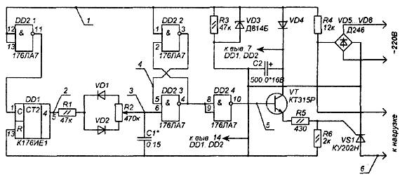 Основное преимущество регуляторов мощности, в которых коммутация тринисторов происходит в момент перехода сетевого напряжения через нуль - малый уровень помех. Для упрощения схемы в этих регуляторах применяют ступенчатое регулирование выходной мощности. В описанном ниже устройстве в качестве регулирующего элемента использован переменный резистор. Число ступеней регулирования можно изменять от четырех до шестнадцати с дискретностью соответственно от 25 до 6,25%. Минимум коммутационных помех во всем диапазоне регулирования мощности обеспечивает включение тринистора при мгновенном напряжении сети около 5 В. Принципиальная схема регулятора мощности на восемь ступеней (т.е. с дискретностью 12,5%) изображена на рис. 1, временные диаграммы - на рис. 2 Импульсы частотой следования 100 Гц формируют из сетевого напряжения диодный мост VD5...VD8, цепь R4VD3R3 и элемент DD2.1, а делитель частоты DD1 понижает ее до 12,5 Гц. Для изменения дискретности регулирования нужно увеличить (или уменьшить) коэффициент деления делителя и во столько же раз соответственно изменить величину емкости С1.