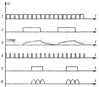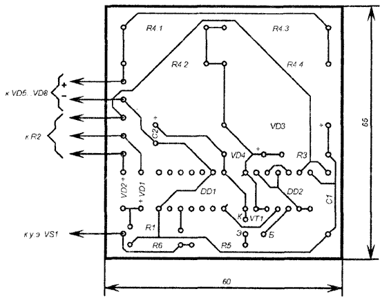 Рис.2. Временные диаграммы Импульсы с делителя переключают RS-триггер на элементах DD2.2, DD2.3. Напряжение на выводе 6 элемента DD2.3 будет возрастать по экспоненциальному закону. При появлении единичного сигнала на этом выводе триггер установится в нулевое состояние (на выводе 4 элемента DD2.3 - сигнал 0). На выводе 10 элемента DD2.4 будет сигнал высокого уровня, который откроет транзистор VT1 и тринистор VS1. Переключение RS-тригера в нулевое состояние будет происходить в момент перехода сетевого напряжения через нуль. При появлении единичного напряжения на выводе 5 счетчика DD1 через цепь R1VD2R2 начинает заряжаться конденсатор С1. При появлении сигнала низкого уровня на выходе счетчика DD1 конденсатор С1 начинает разряжаться через цепь R2-VD1-R1. Напряжение на входе элемента DD2.3 уменьшается, и когда оно станет меньше порогового, триггер перестанет переключаться. Таким образом, регулируя резистором R2 соотношение скорости зарядки и разрядки конденсатора С1, изменяют число импульсов, поступающих на базу транзистора VT1, тем самым, регулируя мощность в нагрузке от нуля (движок резистора R2 в верхнем по схеме положении) до 100% (движок в нижнем положении). По спаду импульса на выводе 6 элемента DD2.3 RS-триггер возвращается в исходное состояние, и транзистор VT1 закрывается. Тринистор VS1 закроется тогда, когда ток нагрузки станет меньше тока удержания тринистора, т.е. в момент, близкий к переходу сетевого напряжения через нуль. В устройстве использованы резисторы МЛТ-0,125, R2 - СП-1. Резистор R4 составляют из четырех параллельно включенных резисторов МЛТ-2. Конденсатор С1 - КМ-5б, С2 - К50-16. Диоды VD5... VD8 - кремниевые с обратным напряжением не менее 300 В и средним прямым током 10 А. Печатная плата устройства изображена на рис. 3.