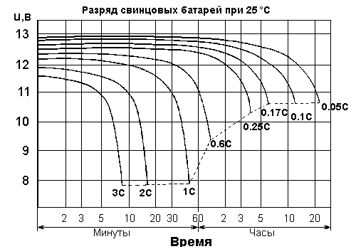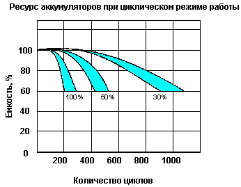 Многократный разряд батареи до напряжений, находящихся ниже штриховой линии приводит к выходу батареи из строя. На практике, SLA работают в двух режимах – буферном и циклическом. При буферном режиме работы батарея постоянно подключена к зарядному устройству. Если в электрической сети есть напряжение, то после заряда батарея в течение длительного времени находится под действием конечного напряжения заряда. Слабый ток, протекающий через батареи, компенсирует саморазряд батареи и постоянно поддерживает батарею в полностью заряженном состоянии. В случае отключения напряжения в электрической сети, батарея разряжается на подключенную к ней нагрузку. Буферный режим работы характерен для систем бесперебойного питания постоянного и переменного тока, которые широко применяются для компьютеров, коммуникаций и непрерывных производств. А также - автомобильных аккумуляторов при регулярной эксплуатации машины. При циклическом режиме работы батарею заряжают, а затем отключают от зарядного устройства. Разряд батареи производится по мере необходимости. Циклический режим работы используется при работе различных переносных или перевозимых устройств: электрических фонарей, средств коммуникаций, измерительных приборов. Производители аккумуляторов обычно указывают в перечне технических характеристик, для какого режима работы предназначен тот или иной аккумулятор. Стало быть, если Вы решили запитать от батарей накалы в ламповом усилителе, то это циклический режим (как приятно узнать, что всю жизнь говорил прозой…). Но значит ли это, что можно просто разряжать батарею до предельно допустимых лампами 5.7 или 11.4В? На деле, пусть этот режим заведомо безопаснее разряда до «аварийных» 5.4 или 10.8В, он при неверном выборе батареи приведет к достаточно глубоким циклам разряда, и тем самым сократит срок ее службы. Глубина цикла разряда определяется как отношение реально отданных в нагрузку ампер-часов к ампер-часам, соответствующим разряду до порога необратимого старения. Ампер-часы в знаменателе будут совпадать с номинальной емкостью только для интенсивности разряда 0.05С. На практике, в качестве знаменателя используется именно номинальная емкость (тем более, что и постоянный ток разряда – не более, чем идеальное приближение).