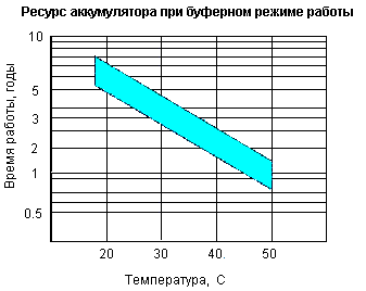Глубина цикла (если она повторяется от цикла к циклу) определяет срок службы батарей. При 100% глубине циклов срок службы SLA не превысит 200-300 циклов. Справочно, автомобильные аккумуляторы с жидким электролитом редко выдерживают более 20 глубоких циклов. При 30% глубине циклов количество их утраивается. Знаменитая Оптима гарантирует выживание при 100 циклах "в ноль" (у автора такая батарея служит четвертый год, но ни одного глубокого цикла "в ноль" так и не было...). 3. Пример из жизни Теперь давайте считать. В каждом канале усилителя –пара ламп 6С4С (6В, 2А). Необходимо обеспечить минимальное время работы между зарядами 8 часов. При этом напряжение не должно опускаться ниже 5.7В (по ТУ лампы), глубина цикла не более 50%. Из последнего требования следует, что емкость батареи – не менее 32А*ч на канал (= 2А * 8ч / 50%) . Интенсивность разряда такой батареи 0.06С (= 32А*ч / 2). Из графика следует, что за 8 часов ее напряжение упадет всего-навсего до 12.0-12.2В. Есть запас! Но только у свежей батареи. Если Вы не забудете ее вовремя заряжать, то примерно через 500 циклов (полтора года ежедневного удовольствия) напряжение за 8 часов будет падать до тех самых 5.7В, если не хуже… Ставьте автоматику на отключение при недостаточном напряжении, обязательно ставьте! Кстати, 32А*ч подозрительно близко к значению емкости автомобильного аккумулятора (50-65 А*ч). Так что для токов 2А и выше необслуживаемый автомобильный аккумулятор – вполне обоснованная (по цене) альтернатива. Вот с экологией и безопасностью у них проблемы. С другой стороны, если большая АКБ не вписывается в конструктив, то можно совершенно без опаски запараллелить несколько меньших батарей (желательно, но не обязательно – одной серии, одного производителя, одного «возраста» с начала эксплуатации). А может, попробовать буферный (дежурный) режим, чтоб заряжать постоянно, без какой-либо автоматики? Тумблер вверх – батарея разряжается, лампы играют, тумблер вниз – идет заряд, лампы… отключены от батарей! Нормальный режим заряда – заряд постоянным напряжением 2.4-2.5В на банку, на зажимах 6В батареи будет до 7.5В – лампы так недолго протянут (особенно если анодное питание выключено). При буферном режиме эксплуатации ресурс батареи сильно зависит от температуры. Наиболее благоприятной температурой для батареи считается температура 15-20 градусов Цельсия. Увеличение температуры на 10 градусов уменьшает ресурс батареи вдвое. На рисунке представлена типичная зависимость ресурса от температуры для аккумуляторов с расчетным ресурсом 5 -7 лет. Резюме – не ставьте батареи в одном корпусе вместе с лампами, пентиумами и т.п. горячими объектами. Вы спросите - а как же под капотом в машине... ну, во-первых, автомобильный аккумулятор специально рассчитан на широкий диапазон температур, во-вторых, теплоемкость АКБ настолько велика, что существенно прогреть ее, даже под капотом, непросто.