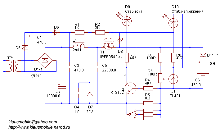 Примечания: На батарее должен быть установлен термостат или термический предохранитель, или необходимо использовать таймер, позволяющий вовремя прекратить процесс заряда. Максимальная величина начального зарядного тока для батарей, емкостью более 10 Ач, должна соответствовать следующему соотношению: I = C максимум Обратите внимание на последний абзац. Он того стоит. Особенно если много батарей замурованы в плохо вентилируемом ящике – перегрев возможен даже при обычном (не ускоренном) заряде, пусть не катастрофический, но все равно сокращающий жизнь батарей. 5. Простое зарядное устройство (медленный заряд I-U) Для заряда небольших батарей наиболее удобна типовая схема на ИС семейства LM117, LM 196, LM317 (142ЕН12, 1151ЕН1, 1157ЕН1). Источник - "Микросхемы для линейных источников питания", М, Додэка, 1998, стр.97, 122 и др.).