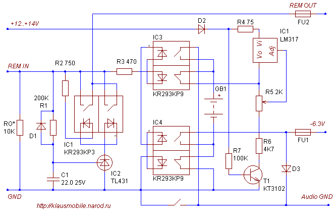 Для питания кроссовера с током потребления 20мА достаточно батарейки на 6В, 1.2Ач (размером чуть более пачки сигарет). Режим заряда I-U (200мА, 7.2 В). При выключенном сигнале REMOTE батарея постоянно заряжается от бортсети (минус на землю, плюс на выход стабилизатора - состояние оптронов как показано на схеме). При включении сигнала REMOTE батарея коммутируется плюсом на землю, минусом на нагрузку (шину питания ОУ). Ток заряда ограничен резистором R3 на уровне 75 мА. Полностью заряженная батарея Fiamm 10121 в таком режиме отнимает у бортсети примерно 15мА при комнатной температуре. Цепочка R7-T1 блокирует разряд батареи на делитель R5-R6 при отключении от бортсети (предполагается, конечно, что REM IN при этом снят и нагрузка от батареи отключена). Потребляемый ток по шине REMOTE 20mA. Таймер D1-C1-R1-IC1-IC2-FU1 задерживает на 2 секунды передачу сигнала REM IN на выход. Резистор R0 нужен только для разряда емкости таймера, в практических схемах его можно исключить или заменить на индикаторную цепь со светодиодом. Диоды D1-3 - любые на постоянный ток 1А. Оптроны КР293КП9А, КР293КП3А можно заменить любыми МДП оптронами на ток не менее 200мА (293КП с литерой А). При коммутации батареи оптроном КР293КП9А с "противофазными" ключами в одном корпусе сквозного тока при коммутации я не наблюдал, при замене на другие оптроны - следует убедиться, что его нет. Предохранители FU1, FU2 - самовосстанавливающиеся на ток срабатывания 200мА. В фильтре питания на выходе источника -6В следует ограничиться минимальной емкостью, чтобы не перегрузить оптроны при коммутации они, кстати, добавляют 10 Ом к выходному сопротивлению батареи). 293 серия не для амперных токов! Это для "взрослых" реле. Это тема следующего проекта - ЦАП с полностью батарейным питанием... но об этом еще рано...