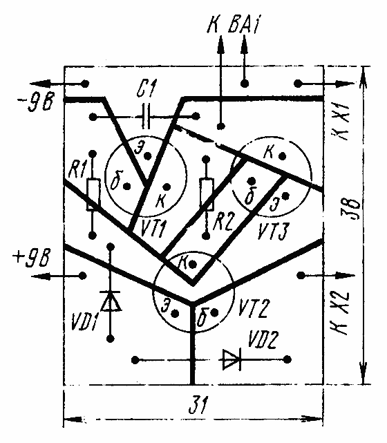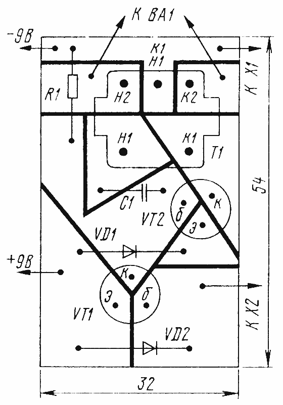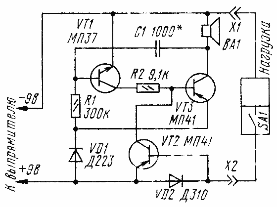 Переносный радиоприемник, магнитофон либо другое устройство в стационарных условиях получают электроэнергию от блока питания, подключенного к осветительной сети. При этом появляется риск, уходя из дома и выключив приемник, магнитофон их собственным выключателем, оставить под напряжением блок питания. Случись в нем повреждение в ваше отсутствие, ущерб может быть весьма велик. Уберечься от подобной неприятности поможет звуковой сигнализатор, схема которого приведена на рис.1. На транзисторе VT2 и трансформаторе Т1 собран по схеме индуктивной трехточки генератор колебаний звуковой частоты. Конденсатор С1 совместно с первичной обмоткой трансформатора определяет высоту тона, воспроизводимого динамической головкой ВА1. Работой автогенератора управляет каскад на транзисторе VT1, у которого переход коллектор-эмиттер включен между базой транзистора VT2 и плюсом блока питания. Диод VD2, включенный параллельно эмиттерному переходу транзистора VT1, стоит в цепи питания нагрузки. Другой диод-VD1 стоит в цепи эмиттера транзистора VT2. Когда нагрузка включена, ее ток создает на диоде VD2 падение напряжения, открывающего транзистор VT1. В результате напряжение на базе транзистора VT2 оказывается положительным относительно эмиттерного, определяемого падением напряжения на диоде VD1. Благодаря этому транзистор VT2 закрыт и сигнализатор "молчит". Если нагрузка выключена своим выключателем (SA1), ток через диод VD2 и падение напряжения на нем исчезают, транзистор VT1 закрывается. Вступает в работу автогенератор, из динамической головки ВА1 раздается звуковой сигнал, напоминающий о необходимости отсоединить блок питания от сети. Рис.1