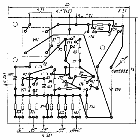 Рис.1 Работает устройство следующим образом. При включении питания конденсатор С3 разряжен, транзистор VT1 закрыт, мультивибратор генерирует импульсы, следующие с частотой около 20 кГц. Усиленные транзистором VT4, импульсы мультивибратора открывают составной транзистор VT5VT6. Когда этот транзистор открыт, ток течет через него, дроссель L1, нагрузку GB1, подключенную к разъемам X1 и Х2, резисторы Р13-R17 (в зависимости от выбранного переключателем SА1 предела зарядного тока) и конденсатор С3. При закрывании транзистора VT4 ток самоиндукции дросселя L1 замыкается через коммутирующий диод VD4, конденсатор С3, нагрузку и резисторы R13-R17.После нескольких импульсов мультивибратора падение напряжения на резисторах R13- R17 достигает 0,65 В, транзистор VT1 открывается и работа мультивибратора прекращается. В установившемся режиме при уменьшении тока нагрузки падение напряжения на резисторах R13-R17 уменьшается, транзистор VT1 закрывается и мультивибратор вырабатывает один импульс длительностью 20 мкс. Затем следует пауза длительностью от 0,045 до 4,5 мс (в зависимости от значения тока нагрузки) - и цикл повторяется. Стабилитрон VD3 и резистор R7 служат для защиты транзистора VT1 на случай короткого замыкания на выходе устройства. Налаживание устройства сводится к тщательному подбору резисторов R13-R17, определяющих токи зарядки элементов или батарей. Дроссель L1, содержащий 250 витков провода ПЭВ-1 0,8, наматывают на магнитопроводе Ш10х10 из феррита 2000НМ. Между его Ш-образными половинами вкладывают прокладки из текстолита толщиной 1,2 мм. Сетевой, трансформатор Т1 выполнен на магнитопроводе Ш20х20. Обмотка I содержит 2000 витков провода ПЭВ-1 0,25, обмотка II - 300 витков провода ПЭВ-1 0,75. Большая часть деталей описанного зарядного устройства смонтирована на печатной плате (рис.2) из фольгированного стеклотекстолита толщиной 2 мм. Транзистор VT6 установлен на теплоотводе площадью 25 кв.см, к нему прижат транзистор VT5. На плате предусмотрены места для резисторов, подключаемых параллельно резисторам R13-R17 при подгонке необходимых токов зарядки.