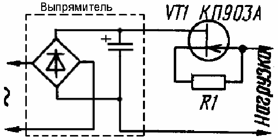 Для питания собираемых конструкций радиолюбители нередко используют простейшие блоки, состоящие из понижающего трансформатора и выпрямителя с конденсатором фильтра. И, конечно, в таких блоках нет никакой защиты от короткого замыкания (КЗ) в нагрузке, хотя оно подчас приводит к выходу из строя выпрямителя и даже трансформатора. Применять в таких блоках питания в качестве элемента защиты плавкий предохранитель не всегда удобно, да и, кроме того, быстродействие у него невысокое. Один из вариантов решения проблемы защиты от КЗ - включение последовательно с нагрузкой полевого транзистора средней мощности с встроенным каналом. Дело в том, что на вольт-амперной характеристике такого транзистора есть участок, на котором ток стока не зависит от напряжения между стоком и истоком. Поэтому на этом участке транзистор работает как стабилизатор (ограничитель) тока.