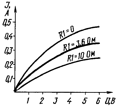 Рис.1 Схема подключения транзистора к блоку питания приведена на рис.1, а вольт-амперные характеристики транзистора для различных сопротивлений резистора R1 - на рис.2. Работает защита так. Если сопротивление резистора равно нулю (т. е. исток соединен с затвором), а нагрузка потребляет ток около 0,25 А, то падение напряжения на полевом транзисторе не превышает 1,5 В, и практически на нагрузке будет все выпрямленное напряжение. При появлении же в цепи нагрузки КЗ ток через выпрямитель резко возрастает и при отсутствии транзистора может достичь нескольких ампер. Транзистор ограничивает ток короткого замыкания на уровне 0,45...0,5 А независимо от падения напряжения на нем. В этом случае выходное напряжение станет равным нулю, а все напряжение упадет на полевом транзисторе. Таким образом, в случае КЗ мощность, потребляемая от источника питания, увеличится в данном примере не более чем вдвое, что в большинстве случаев вполне допустимо и не отразится на "здоровье" деталей блока питания.