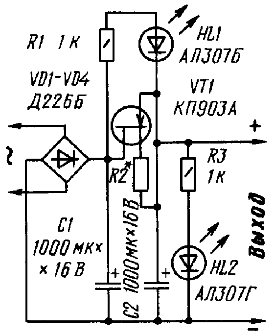 Рис. 2 Уменьшить ток короткого замыкания можно увеличением сопротивления резистора R1. Нужно выбирать такой резистор, чтобы ток короткого замыкания был примерно вдвое больше максимального тока нагрузки.Подобный способ защиты особенно удобен для блоков питания со сглаживающим RC-фильтром - тогда полевой транзистор включают вместо резистора фильтра (такой пример показан на рис. 3). Поскольку во время КЗ на полевом транзисторе падает почти все выпрямленное напряжение, его можно использовать для световой или звуковой сигнализации. Вот, к примеру, схема включения световой сигнализации - рис.7. Когда с нагрузкой все в порядке, горит светодиод HL2 зеленого цвета. При этом падения напряжения на транзисторе недостаточно для зажигания светодиода HL1. Но стоит появиться КЗ в нагрузке, как светодиод HL2 гаснет, но зато вспыхивает HL1 красного свечения.