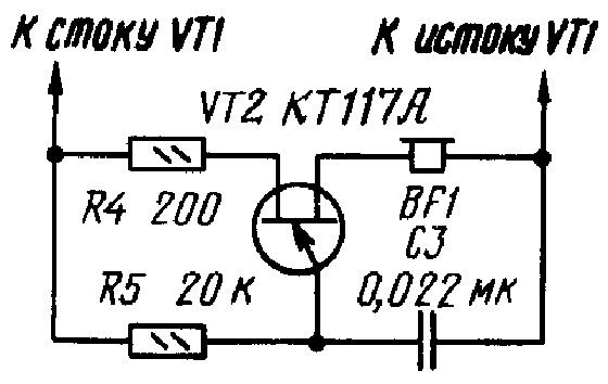 Рис. 3 Резистор R2 выбирают в зависимости от нужного ограничения тока КЗ по высказанным выше рекомендациям.Схема подключения звукового сигнализатора приведена на рис. 4. Его можно подключать либо между стоком и истоком транзистора, либо между стоком и затвором, как светодиод HL1. При появлении на сигнализаторе достаточного напряжения вступает в действие генератор ЗЧ, выполненный на однопереходном транзисторе VT2, и в головном телефоне BF1 раздается звук. Однопереходный транзистор может быть КТ117А- КТ117Г, телефон - низкоомный (можно заменить динамической головкой небольшой мощности).
