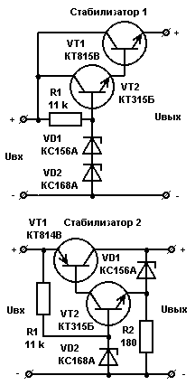 Стабилизаторы напряжения для питания радиоаппаратуры - это те схемы, которые любой радиолюбитель делает десятками, многократно и упешно изобретая “велосипед”. Здесь я сравниваю две схемы из одинаковых деталей и запитанных от одного и того-же выпрямителя. Стабилизатор 1 немного экономичнее из-за отсутствия R2. По всем остальным параметрам стабилизатор 2 лучше на порядок! Схема 2-это модифицированная схема промышленного сетевого адаптера из которой убраны за ненадобностью детали обеспечивающие первичное включение, т.к. опорный элемент я разбил на два VD1,VD2 и запуск происходит автоматически.