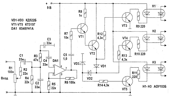 пороговым усилителем на VT3, VT4. VT5. Нагрузкой