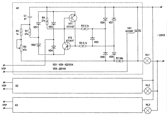 идентичных узла управления. Симисторы VS1, VS2, VS3