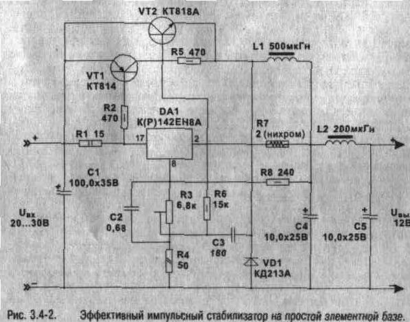 На элементной базе, аналогичной применявшейся в описанном выше (рис. 3.3-3) линейном стабилизаторе, можно построить импульсный стабилизатор напряжения. При таких же характеристиках он будет обладать значительно меньшими габаритами и лучшим тепловым режимом. Принципиальная схема такого стабилизатора приведена на рис. 3.4-2. Стабилизатор собран по типовой схеме с понижением напряжения (рис. 3.4-1а). При первом включении, когда конденсатор С4 разряжен и к выходу подключена достаточно мощная нагрузка, ток протекает через ИС линейного стабилизатора DA1. Вызванное этим током падение напряжения на R1 отпирает ключевой транзистор VT1, который тут-же входит в режим насыщения, так как индуктивное сопротивление L1 велико и через транзистор протекает достаточно большой ток. Падение напряжения на R5 открывает основной ключевой элемент - транзистор VT2. Ток. нарастающий в L1, заряжает С4, при этом через обратную связь на R8 происходит запи- рание стабилизатора и ключевого транзистора. Энергия , запасенная в катушке, питает нагрузку. Когда напряжение на С4 падает ниже напряжения стабилизации, открывается DA1 и ключевой транзистор. Цикл повторяется с частотой 20-30 кГц. Цепь R3. R4, С2 задаст уровень выходного напряжения. Его можно плавно регулировать в небольших пределах, от Ucт DA1 до Uвх. Однако если Uвых поднять близко к Uвх, появляется некото рая нестабильность при максимальной нагрузке и повышенный уровень пульсации. Для подавления высокочастотных пульсации на выходе стабилизатора включен фильтр L2, С5. Схема достаточно проста и максимально эффективна для данного уровня сложности. Все силовые элементы VT1, VT2, VD1, DA1 снабжаются небольшими радиаторами. Входное напряжение нс должно превышать 30 В. что является максимальным для стабилизаторов КР142ЕН8. Выпрямительные диоды применять на ток не менее 3 А.