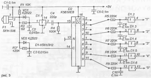 После того, как цепь R3-C3 налажена, можно подавая разные команды с пульта найти соответствующие выходы счетчика D2 и перемычками соединить с ними «тормозящие» RC-цепи, так чтобы получить необходимую систему команд для управления конкретным устройством. Возможно, для некоторых пультов потребуется подбор R2 (если частота повторения пачек значительно отличается от 10 Гц). Первоначально R2 и R3 можно установить подстроечные, а затем заменить их постоянными соответствующего сопротивления. Каравкин В.