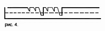Цепь VD2-C3-R3 представляет собой селектор длительности отрицательных импульсов. Он пропускает только импульсы, длительность отрицательного перепада которых более 1,2mS. Импульсы с меньшей длительностью отрицательного перепада не пропускаются, поскольку за время их отрицательного перепада конденсатор С3 не успевает разрядиться через R3 до порога логического нуля. Во время положительных перепадов импульсов этот конденсатор быстро заряжается через прямое сопротивление VD2 и R1. Таким образом, счетчик D2 считает только широкие импульсы командной посылки, а узкие пропускает К концу кодовой посылки на выходе счетчика D2 будет состояние, численно равное количеству логических единиц в кодовом слове, переданном от пульта (например, если кодовое слово было «10010001010», то единица будет на выводе 10 D2). Если же в системе кодирования данного пульта узкие импульсы соответствуют единицам, то число на выходе счетчика D2 будет равно числу нулей в кодовом слове, но в данном случае, это существенного значения не имеет. Главное, что счетчик считает только широкие импульсы. После завершения командной посылки следует пауза. Длительность её такова, что конденсатор С2 успевает зарядиться через резисторы R2 и R1 и на выходе D1.1 возникает нуль, а С4 разряжается через R4. На выходах счётчика остается информация о результате подсчёта широких импульсов в последней кодовой посылке. Поскольку, во время подсчета импульсов состояние счетчика меняется, что бы это изменение не влияло на состояние объекта управления, на выходах включены «тормозящие» цепи R5-C6, R6-C7, R7-C8, R8-C9, R9-C10 и буферные элементы D1.1-D1.5. В данном случае, всего пять выходов, а активное состояние выхода - логический нуль. Схема, показанная на рисунке 3 экспериментальная, и, возможно, используя другие схемные решения можно достигнуть лучшей работы. Например, вместо буферных инверторов с «тормозящими» RC-цепями на выходе можно использовать регистр, в который записывать данные по окончании каждой кодовой посылки или сделать систему триггеров, информация в которых будет обновляться по сигналу логической единицы на входе D1.1. Налаживание. Сопротивление R3 нужно установить таким, чтобы на счётный вход счетчика проходили только широкие импульсы Это можно сделать наблюдая на экране осциллографа форму импульсов на выводе 14 D2 во время приема команд от пульта. Сигнал должен иметь форму, показанную на рисунке 4, причем, широкие импульсы должны достигать уровня логического нуля, а узкие значительно не достигать порога переключения в нулевое состояние.