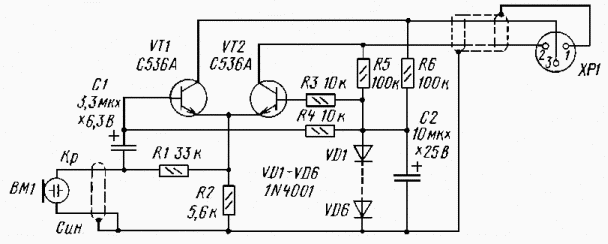 С него же поступает напряжение для питания всего устройства: непосредственно на коллекторы транзисторов VT1, VT2 и через резисторы R5 и R6 на базовые цепи дифференциального каскада. Для стабилизации напряжения базового смещения применен "стабистор" из шести последовательно включенных кремниевых диодов. На них образуется стабильное напряжение около 3,6 В. Применение стабилитрона нежелательно, так как заметно возрастает уровень шума. В устройстве использован микрофон МКЕ-2 фирмы Sennheizer. Можно применить аналогичный микрофон другой фирмы. Вместо транзисторов С536А можно использовать другие малошумящие с максимальным напряжением Uкб >=50В, например, отечественные КТ3102А или КТ3102Б с отбором пары по указанному параметру, а также по параметрам h21э и Uбэ. Конденсаторы С1 и С2 желательно использовать специально предназначенные для звуковой аппаратуры - Black Gate или других известных фирм. Для монтажа усилителя была использована макетная плата с сеткой отверстий 2,5x2,5 мм. Всё устройство разместилось в корпусе от батареи, аналогичной "Кроне", который соединяется проводником с общим проводом. Кабель микрофона подсоединен к плате: красный провод - к точке соединения R1 и С1, а синий - вместе с оплеткой к общему проводу. К точкам на плате, к которым подведены коллекторы обоих транзисторов, и к общему проводу подсоединяют симметричный кабель, на другой конец которого припаян штекер разъема XLR. Проверить электрические режимы устройства можно, подключив его непосредственно к микрофонному входу микшерского пульта (фантомное питание должно быть включено) или же к источнику стабилизированного напряжения +45...48 В. подсоединив контакты 2 и 3 разъема Х1 к плюсовому выводу источника питания через резисторы сопротивлением 33 кОм, а контакт 1 - к минусовому. Измеряя ток в разрыве цепи питания, нужно убедиться в том, что он не превышает 2 мА. Затем необходимо измерить напряжение на резисторе R2; оно должно быть около 3 В. Далее устройство нужно проверить в действии. М. САПОЖНИКОВ, г. Ганей-Авив, Израиль