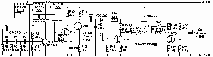 Генератор на транзисторе VT1 через трансформатор Т1 питает переменным током частотой приблизительно 1000 Гц измерительный мост L1L2R3R7. Катушка L1 с разомкнутым магнитопроводом - датчик. Если торцы её магнитопровода плотно прижаты к гладкой поверхности пластины из мягкой стали, индуктивность датчика максимальна и равна индуктивности образцовой катушки L2 Точного баланса моста добиваются подстроечным резистором R3. Если между торцами магнитопровода датчика и пластиной поместить диэлектрическую плёнку, мост разбалансируется и на входе двухкаскадного усилителя на транзисторах VT2 и VT3 появится переменное напряжение амплитудой, пропорциональной толщине плёнки. Усиленный сигнал, выпрямленный диодами VD1 и VD2 (конденсатор С8 - сглаживающий), поступает на вход усилителя постоянного тока на транзисторе VT4, к коллектору которого через резистор R17 подключён микроамперметр РА1. Второй вывод микроамперметра соединён через кнопку SB1 с коллектором транзистора VT5 (непосредственно или через резистор R19 в зависимости от выбранного поддиапазона измерений). При сбалансированном измерительном мосте стрелку микроамперметра РА1 устанавливают на ноль переменным резистором R18. Благодаря тому что каскады на транзисторах VT4 и VT5 идентичны, изменение температуры окружающей сре- ды не вызывает заметного "ухода" стрелки и не вносит погрешности в результат измерения. При замкнутом выключателе SA1 максимальная измеряемая толщина - 0,2 мм, при разомкнутом - 1 мм. Прибор питают напряжением 12 В от любого стабилизированного источника. Я использовал блок питания телевизионного антенного усилителя. Можно применить и батарею гальванических элементов. Напряжения 7...8 В вполне достаточно, поэтому подойдут батареи "Крона" или "Корунд". В этом случае в качестве SB1 рекомендуется установить кнопку с двумя группами контактов. Вторая группа, включённая последовательно в цепь батареи, послужит выключателем питания, что предохранит батарею от разрядки в перерывах между измерениями. Я смонтировал прибор в корпусе авометра Ц43101, оставив в нем "родной" микроамперметр. Трансформатор Т1 - выходной от транзисторного приёмника "Россия-301". В коллекторную цепь транзистора VT1 включена его высокоомная обмотка. Катушки L1 и L2 - телефонные капсюли ТА-56 со снятыми крышками и мембранами. Измерительный "столик" из стального листа толщиной 3 мм с гладкими и свободными от коррозии верхней и нижней поверхностями я разместил на верхней панели прибора. Снизу внутри корпуса прижал к столику жестяным хомутом катушку L2 (образцовую). Катушку L1 (датчик) устанавливаю на столик сверху, подложив под неё измеряемую плёнку, а при проверке нуля - без плёнки. Чтобы получить отсчёт, нажимаю кнопку SB1. Этого не рекомендуется делать, когда датчик не находится на столике. Стрелка микроамперметра, резко отклонившись, может удариться об упор и согнуться. Собрав и включив прибор, прежде всего проверьте осциллографом наличие переменного напряжения на обмотке II трансформатора Т1. Катушку L1 плотно прижмите к поверхности измерительного столика и подстроечным резистором R3 добейтесь минимальных показаний высокоомного вольтметра, подключённого к выводам конденсатора С8. Затем, отключив вольтметр и нажав кнопку SB1, переменным резистором R18 установите стрелку микроамперметра РА1 на нулевую отметку. Проградуируйте шкалу при