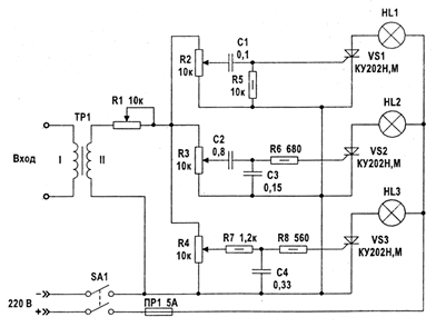 Верхним по схеме является фильтр НЧ, настраиваемый на частоту 100...200 Гц, ниже по схеме идет полосовой фильтр СЧ (200...6000 Гц), а внизу — фильтр ВЧ (6000...7000 Гц). Каналам НЧ, СЧ и ВЧ соответствуют лампы красного, зеленого и синего цветов. Поскольку данная схема не содержит предварительного усилителя, входной сигнал должен иметь амплитуду 0,8...2 В. Уровень сигнала регулируется с помощью резистора R1. Резисторы R2, R3. R4 предназначены для регулирования уровней сигнала по каждому каналу в отдельности. Трансформатор ТР1 выполняется на сердечнике Ш16х24 из трансформаторной стали. Обмотка I содержит 60 витков провода ПЭЛ 0,51. обмотка II — 100 витков ПЭЛ 0,51. Может использоваться и любой другой малогабаритный трансформатор (например, от транзисторных приемников) с соотношением витков в обмотках близким к 1:2. Тиристоры необходимо установить на теплоотводя-щие радиаторы в том случае, если суммарная мощность ламп на один канал будет превышать 200 Вт. Представленная 3-х канальная ЦМУ очень проста в изготовлении, однако