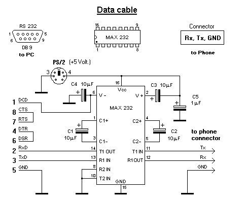 К компьютеру кабель подключается через порт COM (он же RS232 или DB9). Распайки разъемов на мобильных телефонах смотрите в разделе Дата кабели. Питание на 16 ножку микросхемы MAX232, подается от источника 5-ти вольтового питания (в данном случае, от PS/2 порта компьютера). Питание можно также использовать и от USB разъема, или другого стабилизированного источника.