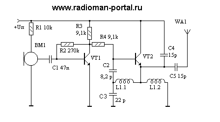 Передатчик построен всего на двух транзисторах, но при этом обладает довольно высокими показателями за счет оригинального включения ВЧ транзистора. При тщательной настройке передатчика, собранного по этой схеме, можно добиться характеристик не хуже, чем у собранных по схеме с использованием однокаскадного усилителя ВЧ. Сигнал с микрофона через разделительный конденсатор С2 и фильтр НЧ С3 поступает на микрофонный усилитель, построенный на транзисторе VT1. Далее, усиленный сигнал через резистор R6 поступает на вход генератора радиочастоты на VT2. Генератор выполнен по схеме с положительной обратной связью (конденсатор С4), в виду чего обеспечивается высокий размах выходного радиосигнала по напряжению и высокая стабильность частоты. Режим по постоянному току генератора задается резистором R6. Конденсатор С4 выбирают по оптимальному размаху ВЧ сигнала, на данной частоте. Например, для частот 92-98 Мгц. величина емкости С4-8.2 pF, конденсатор С6 порядка 22 pF, катушка наматывается виток к витку проводом ПЭВ-0,36 на оправке диаметром 4 мм, и имеет 10 витков с отводом от середины. Транзистор VT2-обязательно КТ325, VT1-КТ3102 с любым буквенным индексом. Микрофон используется малогабаритный, типа "Сосна". Настройка заключается в подборе резистором R4 минимального тока потребления генератора при максимальной выходной мощности, измеряемой активным индикатором поля (с УРЧ) на расстоянии не менее 0.5 м, во избежание паразитных связей. Для обеспечения максимального КПД можно также подобрать емкость С4 по минимальному ограничению несущей в базе транзистора VT2. Для более точной подстройки частоты генератора необходимо немного раздвинуть витки катушки L1.
