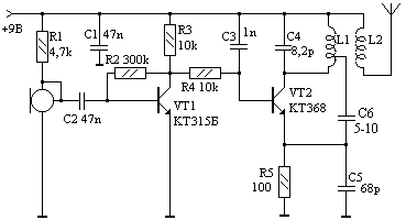 Отличительной особенностью этой схемы является то, что усиленный сигнал ЗЧ с коллектора транзистора VT1 поступает на вход генератора РЧ VT2 без разделительной емкости, ввиду чего рабочая точка генератора по постоянному току определяется рабочей точкой VT1, т.е. резистором R2. Основной задачей при настройке устройства является выбор оптимального соотношения между током потребления генератора и коэффициентом искажений в тракте ЗЧ. В качестве транзистора VT2 желательно применить высокочастотный типа КТ368, КТ325. Для частоты 175 МГц величина емкости С4 составляет 6,8 пФ, L1-5 витков медного посеребренного провода диаметром 0,56 мм с отводом от третьего витка. Диаметр намотки - 5 мм. Катушка связи L2-2 витка првода ПЭВ-0,25 поверх L1. В целях уменьшения габаритов, в данном устройстве применена резонансная антенна. Чтобы сделать такую антанну, надо взять длинную пластмассовую трубочку диаметром 3 мм и намотать на нее в ряд проводом ПЭЛ-0,25 мм 65...70 витков. Затем подключают антенну к выходу генератора, и отматывая по одному витку, контролируют резонанс стрелочным индикатором поля. Схема работает в широком диапазоне напряжений от 1,5 до 15 В, причем частота выходных колебаний, при использовании нерезонансной антенны изменяется в незначительных пределах. При токе потребления 10 мА, приемник чувствительностью 1 мкВ позволяет слушать радиомикрофон на расстоянии до 500 м.