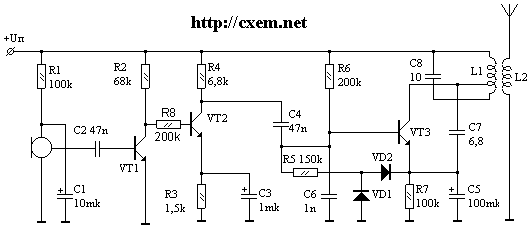 Для наиболее эффективного и рационального использования емкости батарей, для увелечения времени работы передатчика без замены элементов питания, рекомендуется использование активных (включающихся по аккустическому сигналу) закладок, потребляющих незначительный ток в режиме ожидания. Преобразованный звуковой сигнал с микрофона поступает на двухкаскадный усилитель звуковой частоты VT1, VT2, коэффициент усиления которого задается резистором R3, и далее подается на вход генератора VT3. Генератор ВЧ выполнен по схеме индуктивной трехточки. Контур L1C8 настроен на частоту 140 МГц. Последовательная обратная связь осуществляется конденсатором С7. Режим по постоянному току задает резистор R6. Цепочка VD1, VD2, C5 детектирует звуковой сигнал и служит для управления питанием VT3. При помощи резисторов R3, R6 выбирают такое напряжение смещения, чтобы транзистор VT3 в отсутствие звукового сигнала находился в отсечке. Транзисторы VT1, VT2 должны иметь коэффициент усиления не меньше 150, диоды VD1, VD2-германиевые, типа Д9. Катушка L1 содержит 4+1 виток провода диаметром 0,68 мм, намотанных на оправке диаметром 4 мм. Катушка L2 намотана поверх L1 прводом 0,25 мм и содержит 3 витка.