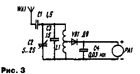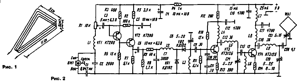 Задающий генератор рекомендую собрать на одной плате с усилителем мощности, причем первый желательно поместить в металлический экран, второй же экранировать необязательно. На плате следует жестко закрепить контурную катушку L1, поскольку ее перемещение при тряске радиомикрофона влияет на стабильность частоты задающего генератора. При монтаже радиомикрофона использованы постоянные резисторы МЛТ-0,125, переменный резистор R1 - СПЗ, конденсаторы - любые малогабаритные. Катушки L3, L4, L5, L8, L9 бескаркасные и намотаны проводом ПЭЛ 0,8. Катушка 13 содержит 7, L4,18 - 4, L5,19 - 9 витков. Внутренний диаметр катушек-10 мм. Катушки L4 и L8 намотаны виток к витку, зазор между витками катушек L3, L5, L9 - около 1 мм. Дроссели L1, L2, L6, L7 намотаны виток к витку на спичках и содержат 45-55 витков провода ПЭЛ 0,1. В радиомикрофоне применен электретный микрофон МЭК-3 от отечественного переносного магнитофона. Цвета подходящих к нему проводов указаны на схеме. Для настройки радиомикрофона потребуется простейший авометр (например Ц-20) и индикатор поля (рис. 3). Стрелочный индикатор использован от переносного магнитофона. Катушка L1 индикатора поля содержит 6 витков провода ПЭЛ 0,8 с отводом от середины, намотка с шагом 1 мм. В качестве его антенны использован кусок изолированного провода длиной 10...15 см.