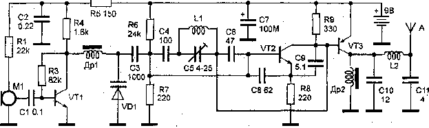 Частота этого генератора зависит от параметров контура L1, СЗ, С4, С5, С6, VD1. Сигнал ВЧ, снимаемый с коллектора транзистора VT2, усиливается усилителем мощности на транзисторе VT3 типа КТ361. Усилитель мощно-сти имеет гальваническую связь с задающим генератором. Уси-ленное высокочастотное напряжение выделяется на дросселе Др2 и поступает на П-образный контур, выполненный на элементах С11, L2, С10. Последний настроен на пропускание основного сигнала и подавление множества гармоник, возникающих на коллекторе тран-зистора VT3. Радиомикрофон собран на плате размером 30х70 мм. В качестве антенны используется отрезок монтажного провода длиной 25 см. Все детали малогабаритные. Резисторы - типа МЛТ-0,125, конденсаторы - К50-35, КМ, КД. Вместо варикапа VD1 типа КВ109А можно использовать варикапы с другим буквенным индексом или варикап типа KB 102. Транзисторы могут иметь любой буквенный индекс. Транзисторы VT1 и VT2 можно заменить на КТ3102, КТ368, а транзистор VT3 - на КТ326, КТ3107, КТ363. Дроссели Др1 и Др2 намотаны на резисторах МЛТ 0,25 сопро-тивлением более 100 кОм проводом ПЭВ 0,1 по 60 витков каждый. Катушки L1 и L2 бескар-касные, диаметром 5 мм. Катушка L1 - 3 витка, катушка L2 - 13 витков провода ПЭВ 0,3.