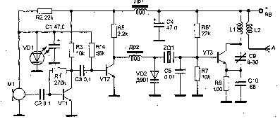 При использовании кварцевого резонатора с высокой частотой появля-ется возможность создать простой ра-диомикрофон с высокой стабильнос-тью несущей частоты. Ниже приведено описание подобного устройства. Радио-микрофон работает в диапазоне 61-74 МГц с частотной модуляцией. Принципиальная схема передатчика радиопередатчика приведена на рис. 1. Сигнал с микрофона Ml типа МКЭ-3 усиливается двухкаскадным усилителем на транзисторах VT1, VT2 типа КТ315. Задающий генератор выполнен на транзисторе VT3 типа КТ368. Частотная модуляция несу-щей частоты обес-печивается варикапом VD2. Резисторы R6 и R7 в базо-вой цепи транзистора VT3 определяют его режим по постоян-ному току. Конденсатор С9 устанавливает необходимый режим генерации, обес-печивая положительную обратную связь. Стабильность частоты генератора зависит в основном от напряжения питания. Чтобы ее повысить, необходи-мо использовать стабилизатор на 6-9 В, что приведет к усложнению схемы. Стабилизировать частоту можно и другим способом. Если быть точным, то причина нестабильности несу-щей частоты определяется в основном колебаниями рабочей точки тран-зистора VT2 усилителя звуковой частоты при изменении напряжения питания. Положение этой рабочей точки определяет напряжение обрат-ного смещения на варикапе VD2 , а значит, и его начальную емкость. Для стабилизации рабочей точки усилителя на транзисторе VT2 в его базовую цепь включен резистор R4, напряжение на который поступает с параметрического стабилизатора, собранного на резисторе R2, светодиоде VD1 и конденсаторе С1. В устройстве использованы постоянные ре-зисторы МЛТ-0,125, конденсаторы типов К50-16 и КМ.