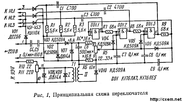 Принципиальная схема такого варианта переключателя приведена на рис. 1. На микросхеме DD1 собран трехфазный управляемый генератор. Поскольку на всех выходах элементов 2И-НЕ форма импульсов прямоугольная, то формирователь импульсов генератора отсутствует и выходы элементов микросхемы подключены через разделительные конденсаторы С1 — С3 к управляющим электродам тринисторов VS1 — VS3. Ток, потреребляемый переключателем от сети, не превышает 4 мА.