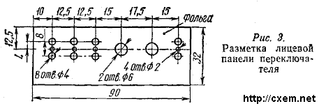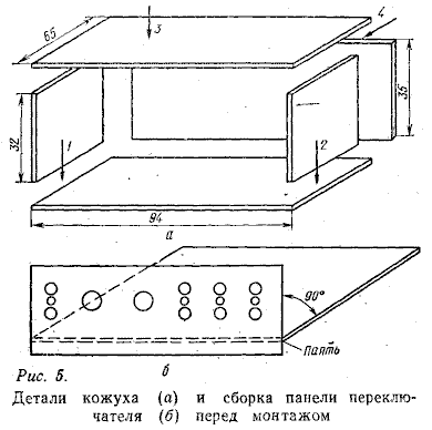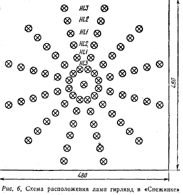 Тринисторы и диод устанавливают на печатную плату на небольших теплоотводящих П-образных алюминиевых радиаторах площадью 20...25 см2. Естественно, что печатную плату для такого варианта переключателя придется переработать и размеры несколько увеличить. Лицевую панель (см. рис. 3) изготавливают из одностороннего фольгированного стеклотекстолита. Кожух для переключателя можно изготовить из плотного картона толщиной 1,5 мм (рис. 5, а). Сначала размечают и вырезают пять заготовок, затем промазывают места склейки клеем “Момент-1” и дают просохнуть 15 мин. Коробку собирают последовательно склеивая каждую заготовку (порядок сборки указан на рис 5а, цифрами 1—4). Готовый кожух пропитывают бесцветным лаком или окрашивают. Для печатной платы с мощными тринисторами кожух желательно изготовить из более прочного материала, предусмотрев в нем отверстия для вентиляции. В описываемом переключателе для подключения гирлянд и подачи звукового сигнала использованы контрольные гнезда МГК1 и штекеры МШ1. Для переключателя второго варианта гнезда следует применять с большей контактной поверхностью или использовать разъем. Конденсаторы С1—С3 КЛС, С7—С9—К10-9 на любое номинальное напряжение; С4 и С5—МБМ С6 — К50-6. Все постоянные резисторы МЛТ-0,125 или МЛТ-0,25 Переменные резисторы R5 и R11 СП3-9а. Резисторы R5, R10, R11 и гнезда МГК1 устанавливают на лицевой панели. Статические коэффициенты передачи тока транзисторов (см. рис. 4) должны быть не менее 100. Трансформатор Т1, использованный в переключателе от портативного радиоприемника. Его магнитопровод Ш3Х6, обмотка 1 (по схеме) содержит 102 витка провода ПЭВ-1 0,23, обмотка 2 — 450+450 витков провода ПЭВ-1 0,09. Но трансформатор может быть самодельным с несколько большим сечением сердечника магнитопровода и коэффициентом трансформации 10:1. Обмотки нужно хорошо изолировать друг от друга. Схематическое расположение ламп в “Снежинке” показано на рис.6. Лампы на изолированной термостойкой плоскости объединяют в три группы - гирлянды по 24 штуки в каждой и соединяют последовательно в виде шести концентрических окружностей, чередуемых через две: 1—2—3, 1— 2—3 и т. д. Последовательно с каждой гирляндой включают гасящий резистор сопротивлением 100 Ом типа ПЭВР-20 для подбора оптимального накала нитей ламп. Центральную лампу подключают к гирлянде 3. Такое расположение ламп позволяет получить волнообразное движение светового потока от центра к периферии и наоборот — в зависимости от амплитуды звукового сигнала (подобно волнам, образуемым от брошенного в воду камня) Колебания волн различны, так как возникают они за счет биений на гармонических составляющих частот сети и трехфазного генератора. “Снежинку” легко превратить в иллюминацию “Радуга”, если лампы, образующие концентрические окружности, окрасить последовательно в цвета радуги, начиная с красного. Один из цветов, например голубой, пропускают. Мощность, потребляемая одной гирляндой (без учета гасящего резистора в ее цепи), составила: Рг = NP*л1*SQR2 = 24*25*1*1,41 = 840 (Вт). Площадь теплоотводящих радиаторов для диода и тринисторов была увеличена до 50 см2. Э. Литке