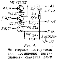 Управление частотой генератора производится одним переменным резистором R5, с движка которого на входы элементов микросхемы подается постоянное напряржение смещения (через диоды VD4— VD6). Частота генератора при нижнем (по схеме) положении движка резистора R5, когда диоды VD4—VD6 закрыты, определяется из выражения: f = 1/T = 1/3t где t — постоянная времени, равная R7C7. Если t вычислено в миллисекундах, то f =1000 /3t (Гц). Расчет начинают, задаваясь нижней частотой генератора 40 Гц и емкостью одного из конденсаторов С7— С9, близкими по номиналу, например 0,115...0,12 мкФ. ТКЕ этих конденсаторов должен быть минимальным, чтобы уменьшился уход частоты от нагрева. Емкость конденсатора С7 подставляют в формулу и определяют номинал резистора R7. Далее, после сборки переключателя и монтажа печатной платы (см. рис. 2, 3 и 5, б), устройство включают с одной гирляндой и подбирают номинал резистора R4 в зависимости от имеющегося переменного резистора R5 (22...33 кОм) так, чтобы верхний предел частоты генератора был 63...65 Гц. При подборе резистора R4 и измерении частоты необходимо соблюдать меры предосторожности, так как переключатель не имеет гальванической развязки с питающей электросетью. Для развязки желательно использовать временно небольшой разделительный трансформатор. Затем проверяют работу переключателя при включенных трех гирляндах. Гирлянды должны переключаться строго поочередно с небольшим перекрытием по накалу. Для создания цветомузыкального эффекта бегущих или вращающихся огней с изменением частоты переключения в такт мелодии, переключатель дополнен разделительным повышающим трансформатором Т1 (рис. 1). Его первичную (низкоомную) обмотку подключают через резисторы R11 и R10 к выходу усилителя звуковой частоты или непосредственно к звуковой катушке динамической головки, а вторичную -- через диод VD10 к резистору R6. Напряжение звуковой частоты, повышенное трансформатором до 5...6 В, подается в цепь смещения на входы элементов микросхемы. Управляемый генератор при этом работает как нелинейный преобразователь “напряжение—частота”, способный увеличивать частоту генерации в 10 раз. Переключение гирлянд получается оригинальным и своеобразным благодаря тому, что при малом уровне сигнала частота переключения изменяется сначала медленно, затем с увеличением амплитуды — быстро с небольшой задержкой, определяемой постоянной времени цепочки R5, С7- С9. При большом уровне сигнала звуковой частоты генератор переходит в режим порогового усиления напряжения, и гирлянды начинают загораться с разным накалом в такт звучания мелодии. Стабилитроны VD8 и VD9 защищают трансформатор и микросхему от перегрузки. Настройку переключателя в цветомузыкальном режиме производят в последнюю очередь. Регулировкой резистора R5 добиваются самого замедленного переключения гирлянд или полной остановки без подачи звукового сигнала. Включают усилитель на нужную громкость и резистором R11 подбирают желаемый эффект переключения. Для повышения интенсивности свечения ламп в освещенном помещении мощность их необходимо значительно увеличить. В этом случае тринисторы КУ110А (VS1—VS3) заменяют на КУ202Н, диод Д226Б (VD1) на Д246—Д248 и переключатель дополняют эмиттерными повторителями (рис. 4).
