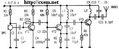 Сигнал с микрофона ВМ1 через усилитель ЗЧ VT1 проходит на вход генератора ВЧ, выполненного по схеме емкостной трехточки. Выходной контур генератора L1C5 настроен на частоту 235 мГц. Далее выходной сигнал ВЧ усиливается каскадом на транзисторе VT3, контур L2,C10,C11 которого настроен на частоту 470 Мгц, которую можно изменять конденсатором С10.