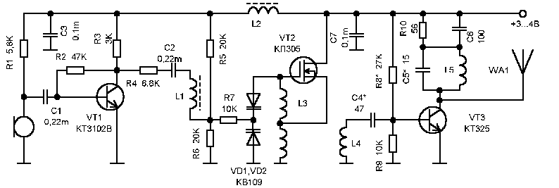 Предлагаемый микрофон может питаться от 2-3 аккумуляторов. Дальность действия - 200...300 м в условиях прямой видимости. Ток потребления - 20...25 мА. Его можно уменьшить до 10 мА при питании 1,5В (с уменьшением дальности до 20...30 м). Катушки L1 и L2 намотаны на кусочке ферритового кольца диаметром 7 мм и имеют 50...80 вит. проводом ПЭЛ-0,1. Катушки L3 - L5 бескаркасные. Они наматываются на оправке диаметром 3 мм виток к витку в один слой. L3 - 3+3 вит., L4 - 2 вит., L5 - 6 вит. проводом ПЭЛ-0,45. При питании 1,5В катушка L3 содержит 4+2 вит. При налаживании резистор R8 нужно подобрать по максимуму излучаемой мощности (дальности действия).