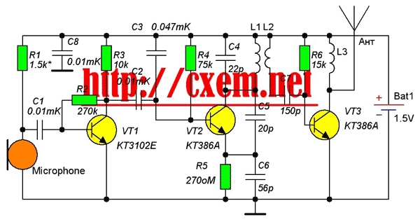 Детали:VT1 - любой транзистор типа КТ315(КТ3102). Подбираете в зависимости от требуемой чувствительности микрофона.VT2,VT3 - КТ368 (Коэффициент усиления - не менее 100). Желательно использовать в металлическом корпусе. M1 - микрофон типа "сосна", МКЭ-3 или какой-нибудь импортный. L1 - 3 витка проводом 0,5 мм на оправе 5 мм. L2 - 2 витка проводом 0,5 мм на оправе 5 мм. L3 - 8 витков проводом 0,25 мм на оправе 5 мм. После сборки, желательно поместить всю схему в металлический корпус. Схему разработал: Глянь Андрей, набрал и опубликовал: Колтыков Анатолий. Данная схема защищена авторскими правами.